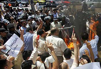 Egyptian protesters burn a United States flag during a demonstration in Cairo May 27 against the alleged desecration of the Koran by military interrogators. (Photo: - / AFP-Getty Images) |