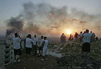 Lebanese civilians watch an Israeli aircraft (not pictured) bombing Beirut at sunset Friday. (Photo: Joseph Barrak / AFP-Getty Images) |