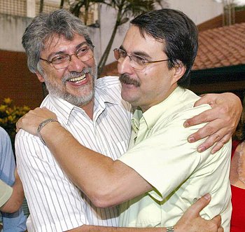 Paraguayan former bishop Fernando Lugo (L) and the governor of the Central Department, Federico Franco, of the Liberal party, embrace during a coordination meeting in Asunción. (Photo: Norberto Duarte / AFP-Getty Images) |