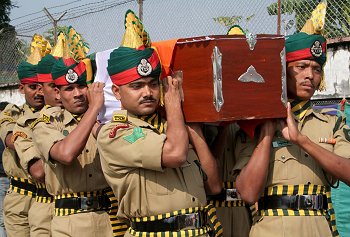 Troops carry the coffin of Maharaja Kirit Bikram Kishore Manikya Bahadur in Agartala, capital of the erstwhile princely state of Tripura. (Photo: Bapi Roy Choudhury) |