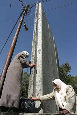 Palestinian women climb over a section of Israel's separation barrier earlier this year in the West Bank town of Abu Dis, on the edge of Jerusalem. (Photo: Gali Tibbon / AFP-Getty Images) |