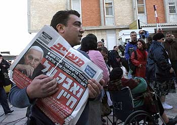 A man carries a bundle of Israeli newspapers featuring a picture of Israeli Prime Minister Ariel Sharon and the headline "Struggle for his Life" on the front page, outside Hadassah hospital in Jerusalem yesterday. (Photo: Gali Tibbon / AFP-Getty Images) |