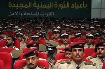Yemeni army officers listen as President Saleh delivers a speech marking the 45th anniversary of the revolution at the Army college in Sanaa on Sept. 25. (Photo: Khaled Fazaa / AFP-Getty Images) |