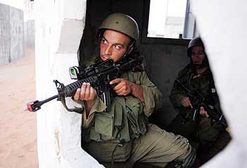 An Israeli soldier practices holding a position at the Urban Warfare Training Center in Tse'elim camp, southern Israel, on June 19. (Photo: Jack Guez / AFP-Getty Images) |